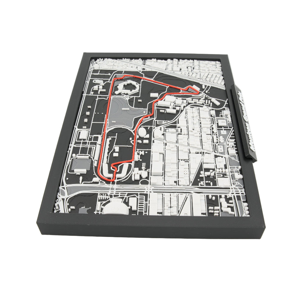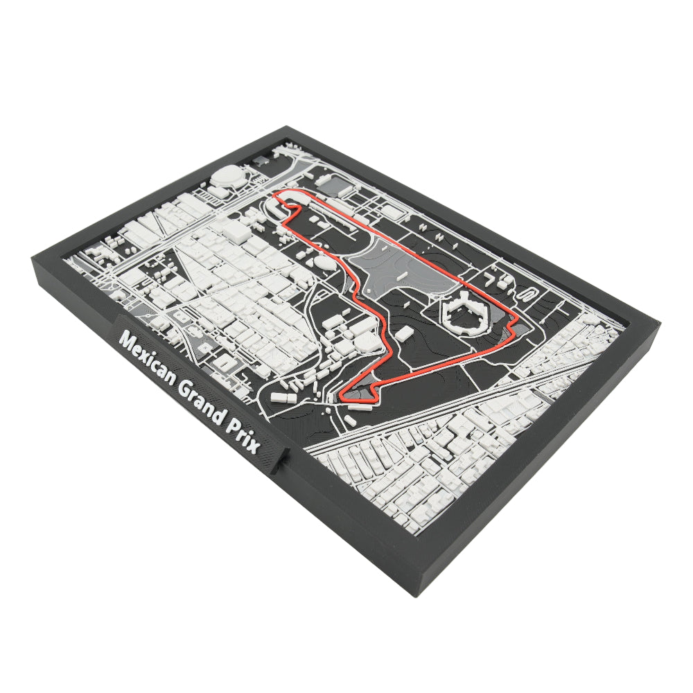 Celebrate the excitement of the Mexican Grand Prix with this precision crafted 3D circuit map, designed to highlight the full race layout in a bold red path against a detailed, topographic miniature of the surrounding cityscape. Layered contours, raised structures, and crisp street patterns create a sculptural depth that stands out in any room, making it an ideal display piece for motorsport enthusiasts and collectors.